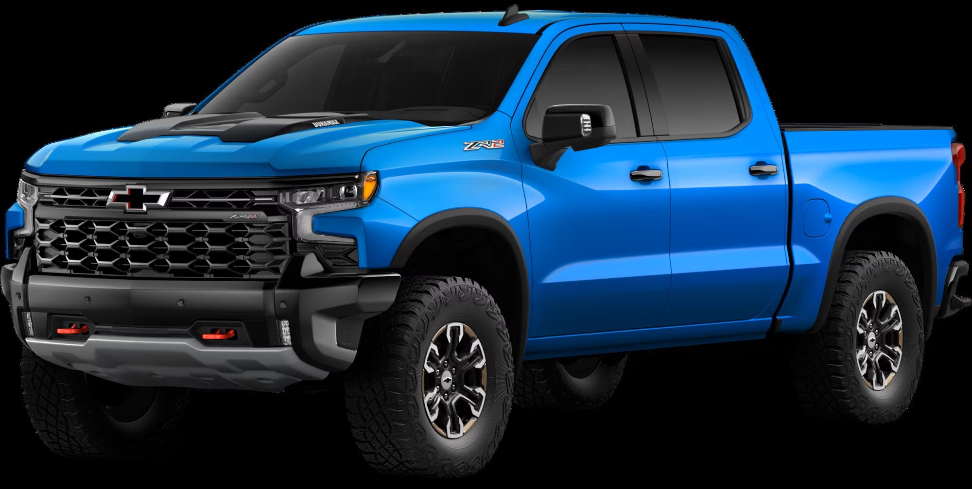 The ZR2 trim is built for drivers who want the strongest off-road setup in the Silverado lineup. It’s available with either the 6.2-liter V8 or the Duramax diesel engine. Standard equipment includes 33-inch all-terrain tires, locking front and rear differentials, off-road suspension dampers, skid plates, and a full-size spare tire. Inside, the ZR2 adds ventilated front seats, a power-adjustable passenger seat, heated rear seats, wireless phone charging, a Bose audio system, and a surround-view camera. Safety features such as blind-spot monitoring and rear cross-traffic alert are also included.